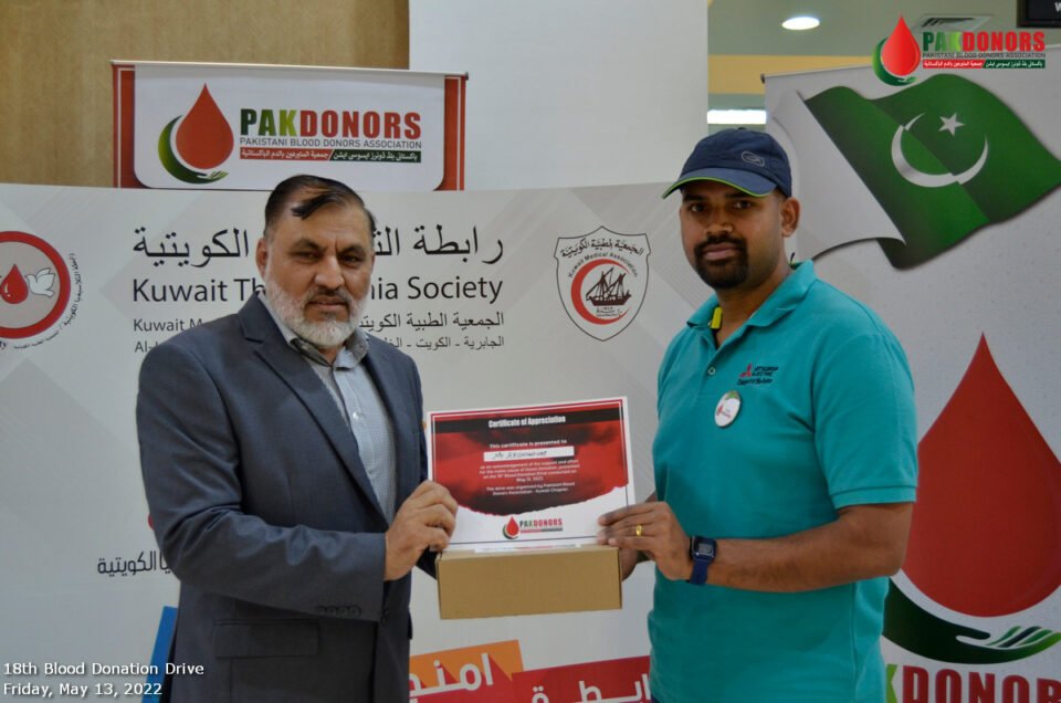 PAK Donors hold their 18th Blood Donation Drive on Friday, May 13, 2022. They organized the drive at the premises of Kuwait Central Blood Bank, Jabriya. Team PAK Donors dedicated this drive to fight against Thalassemia. Kuwait Thalassemia League also participated in the drive. A delegation led by Dr Maha Bourusly, Head of Kuwait Thalassemia League, graced the event to appreciate the donors.